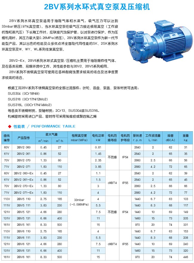 2BV水环真空泵适用于抽除气体和水蒸气,吸气压力可以达到33mbar绝压(97%真空度)。当真空泵在吸气压力低于80mbar的状态下长期工作时,应联接气蚀?;す埽远员媒斜;?。如配大气喷射器,吸气压力可达10mbar,喷射器可直接安装在真空泵上。作为压缩机用时,其压力至0.26MPa(绝压) 。